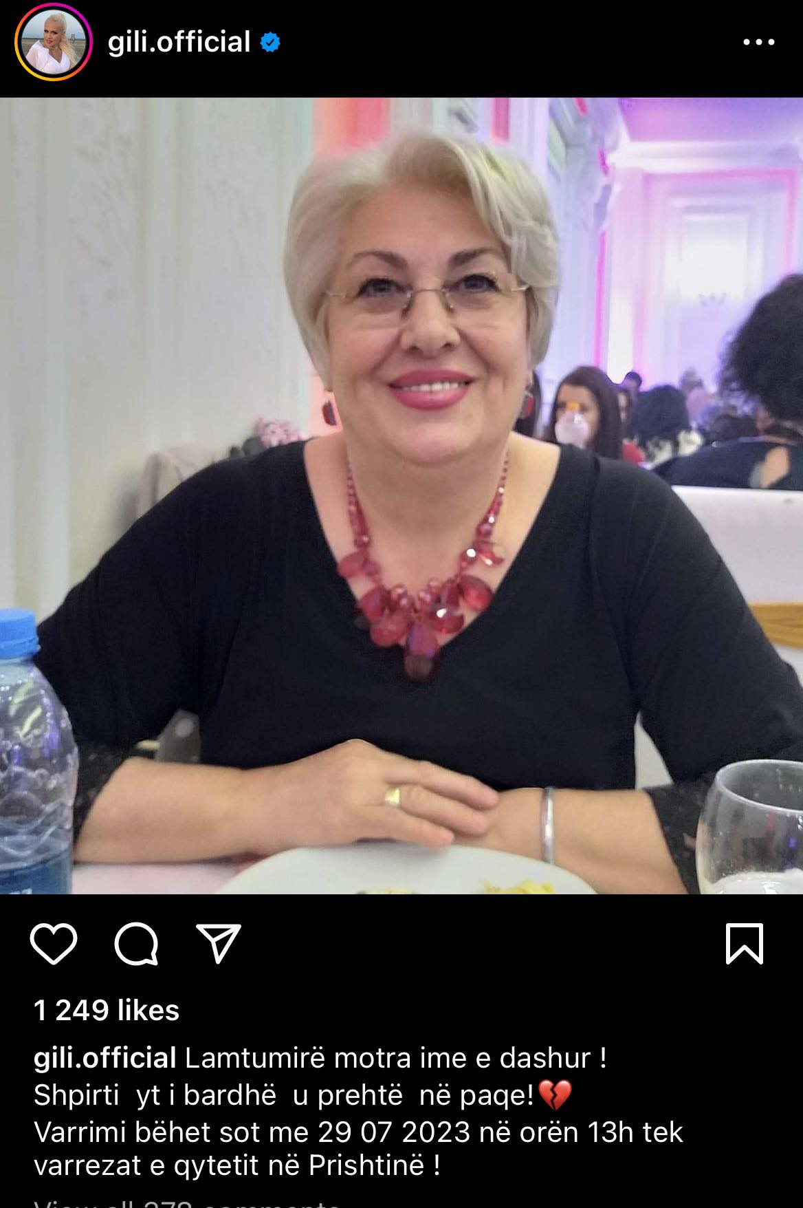 “Me dhimbje të thellë ju njoftoj qe sot nderroi jetë motra ime e dashur Mirvete Kunushevci – Spahiu.Shpirti i saj i bardhë u prehtë në paqe! Varrimi i së ndjerës bëhet sot me 29.07.2023. Për orën e varrimit ju njoftojmë me kohë!”, shkruhet në njoftimin që këngëtarja ka postuar në rrjete sociale.