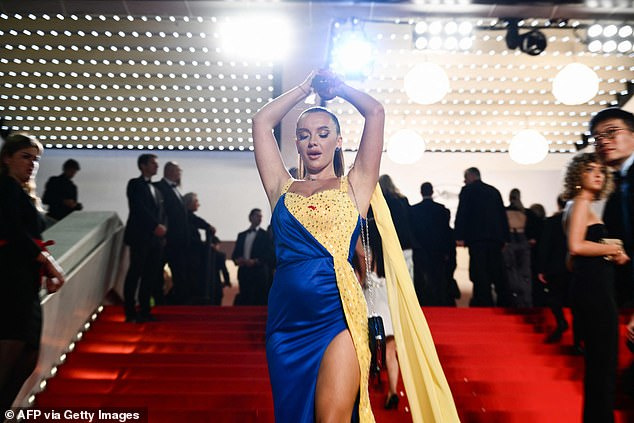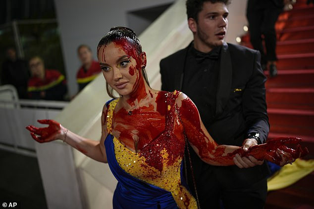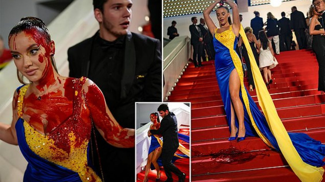 Një protestuese e veshur me një fustan në ngjyrat e flamurit ukrainas organizoi një lloj proteste në tapetin e kuq të Festivalit të Filmit në Kanë, duke derdhur gjak të rremë mbi veten përpara se të ndërhynte sigurimi.