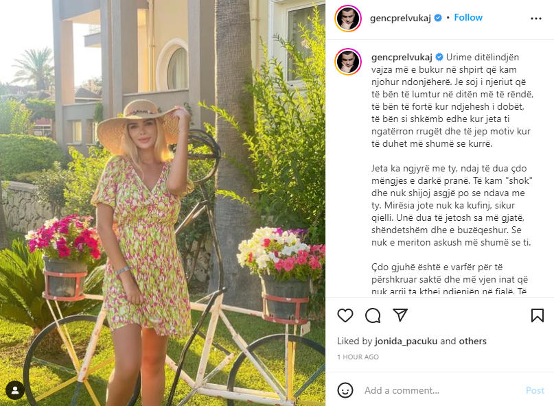Çdo gjuhë është e varfër për të përshkruar saktë dhe më vjen inat që nuk arrij ta kthej ndjenjën në fjalë. Të dua lule e bukur”, ka shkruar ai./arbresh.info/