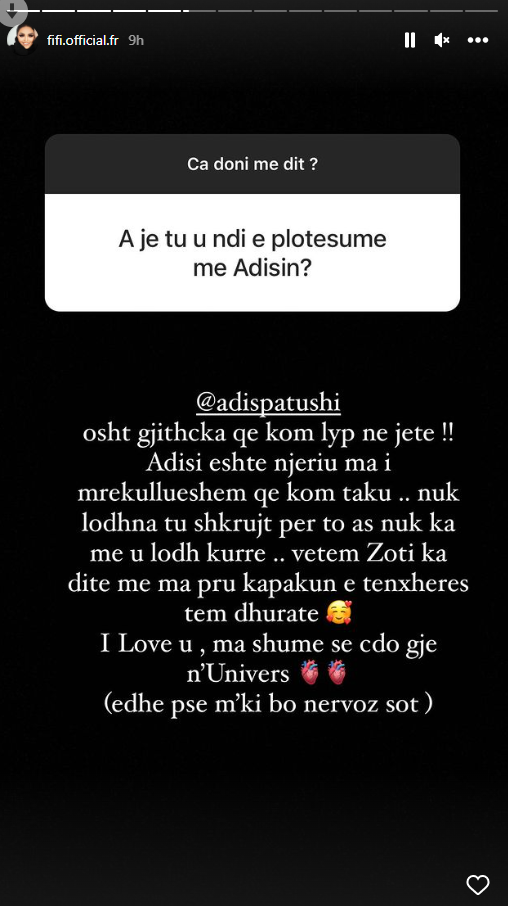 Rëndësinë që Adisi ka për të, Fifi e ka treguar edhe gjatë një pyetësori që këngëtarja ka zhvilluar me fansat në Instagram.