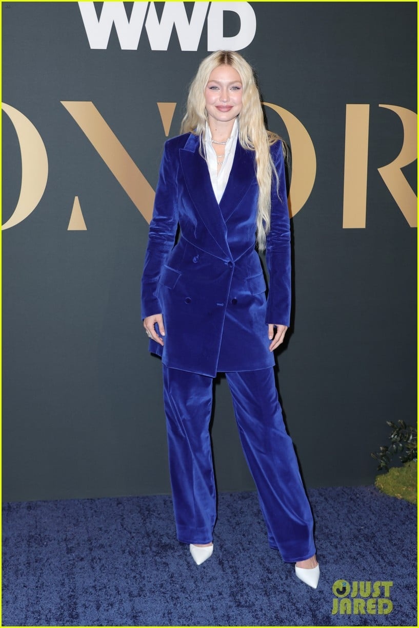 Në Çmimet e Nderimeve WWD 2022 më 25 tetor. Supermodelja, mahniti në tapetin e kuq me një prerje të gjatë në një kostum elegant prej kadifeje blu mbretërore , kombinuar nga një bluzë e bardhë dhe stiletto klasike të bardha.