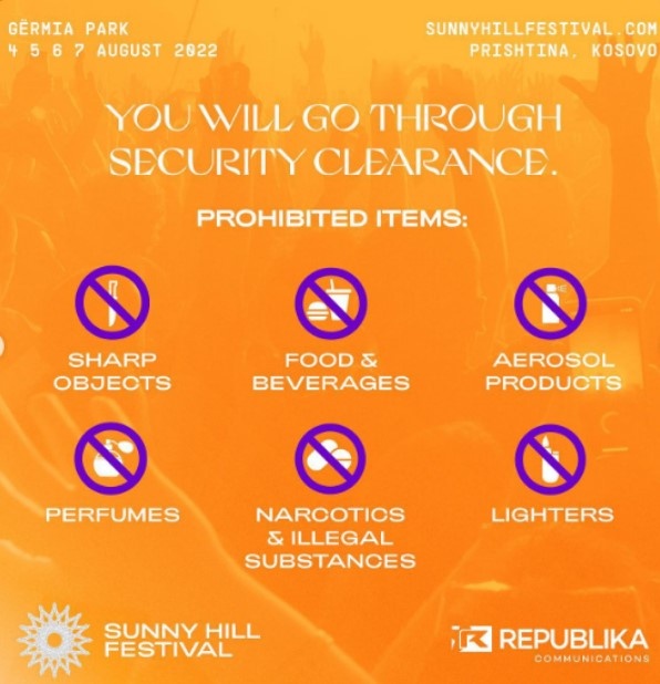 Në faqen zyrtare të “Sunny Hill Festival” janë bërë të ditura gjërat që s’lejohen t’i keni me vete në festival, i cili do të fillojë nesër e do të vazhdojë deri të dielën.