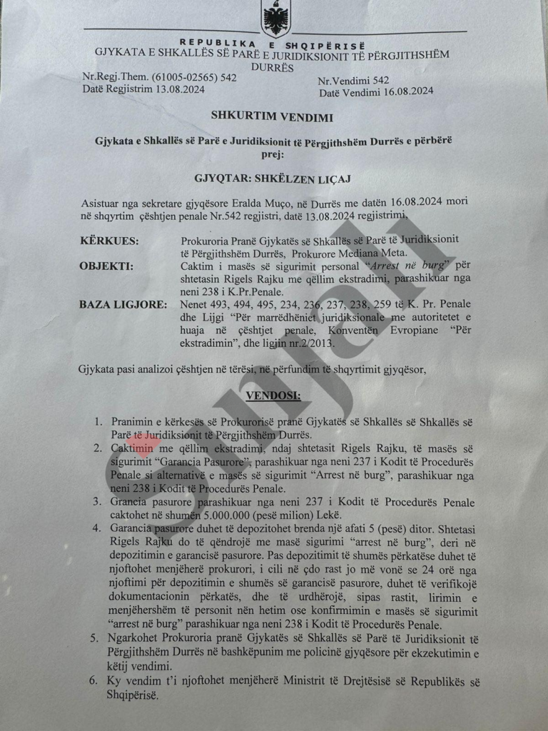 Vendimi është marrë pak më parë nga Gjykata e Durrësit e cila po e trajtonte rastin e Rigels Rajku, reperit të njohur shqiptar, i cili ishte arrestuar pasi dyshohej për një sherr që kishte ndodh në një diskotekë në Pejë.