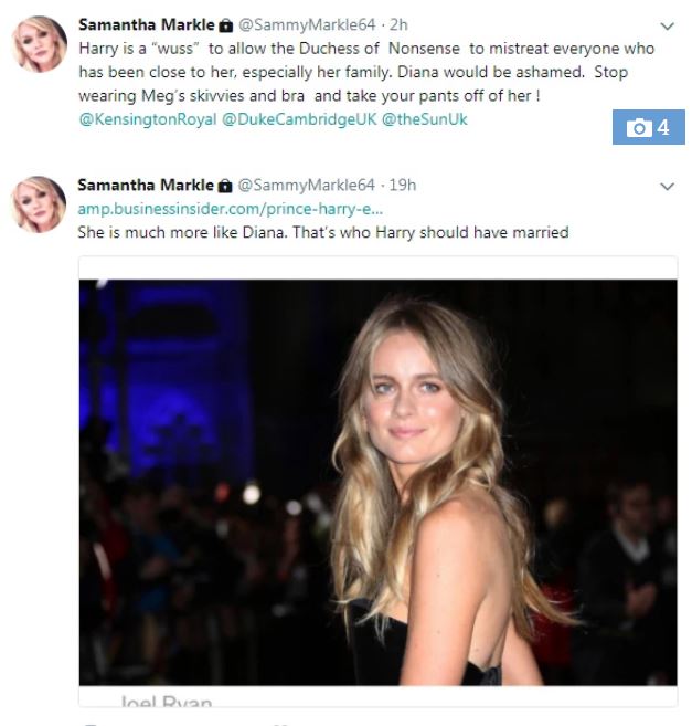 Me anë të një postimi në Twitter, Samantha e ka etiketuar Dukeshën e Sussex si ‘Dukesha e Budalliqeve” dhe se princeshë Diana do ndihej e turpëruar nëse do ishte gjallë.