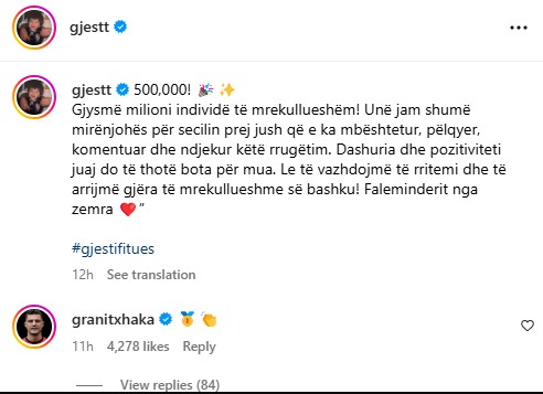 Në postimin e fundit të këngëtarit, Xhaka ka reaguar duke e quajtur atë “kampion” duke vendosur një emoji të medaljes me numrin një, si dhe një tjetër me duartrokitje, duke lënë të kuptohet se është një mbështetës i madh i tij.