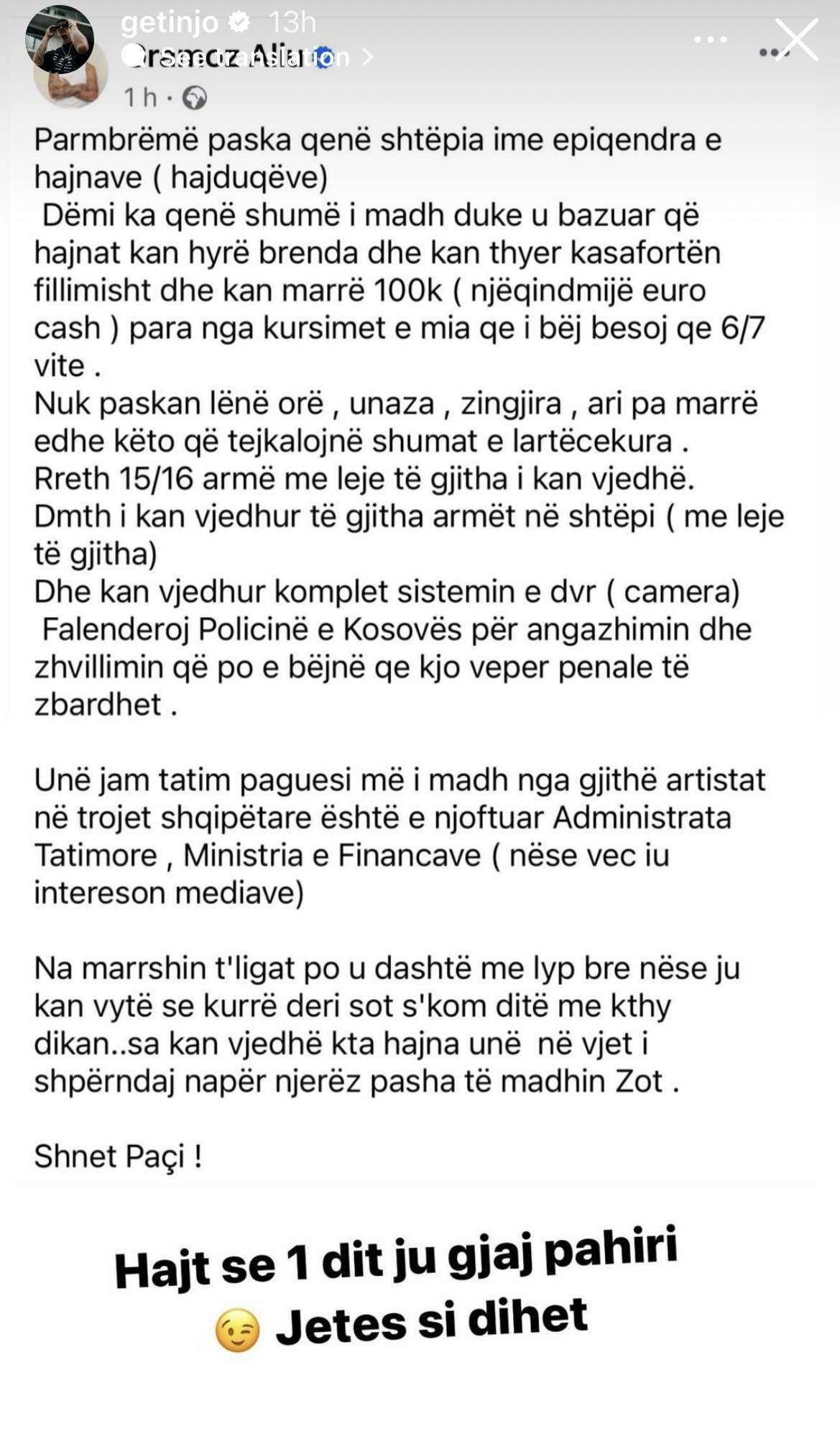 “Dëmi ka qenë shumë i madh duke u bazuar që hajnat kan hyrë brenda dhe kan thyer kasafortën fillimisht dhe kan marrë 100k ( njëqindmijë euro cash ) para nga kursimet e mia qe i bëj besoj qe 6/7 vite. Nuk paskan lënë orë , unaza , zingjira , ari pa marrë edhe këto që tejkalojnë shumat e lartëcekura . Rreth 15/16 armë me leje të gjitha i kan vjedhë.Dmth i kan vjedhur të gjitha armët në shtëpi ( me leje të gjitha) Dhe kan vjedhur komplet sistemin e dvr ( camera)”, ka shkruar Aliu.