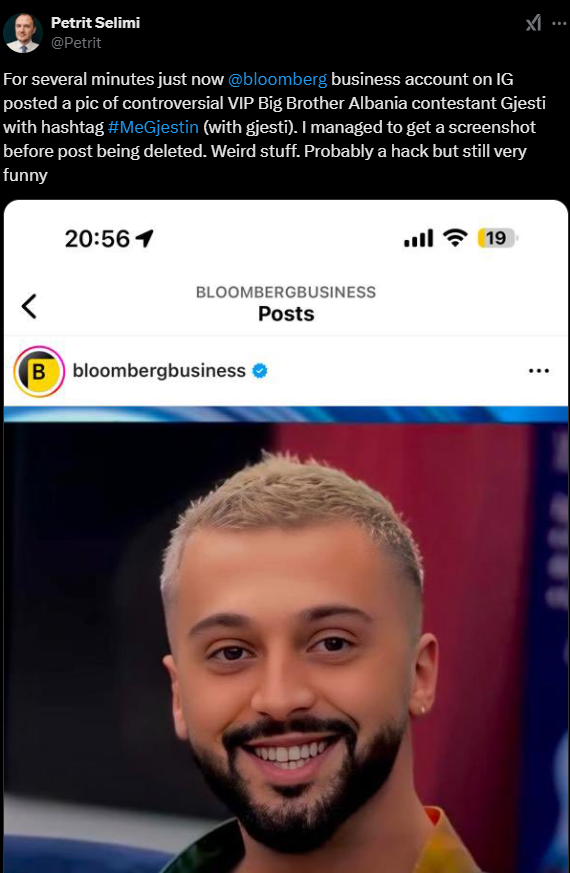 “Për disa minuta ‘bloomberg’ llogaria e biznesit në Instagram ka postuar një foto të konkurrentit të diskutueshëm VIP të Big Brother Albania, Gjesti me hashtag #MeGjestin (me gjesti). Arrita të marr një pamje nga ekrani përpara se postimi të fshihej. Gjëra të çuditshme. Ndoshta një hakim, por është shumë qesharake”, ka shkruar ai./Arbresh.info