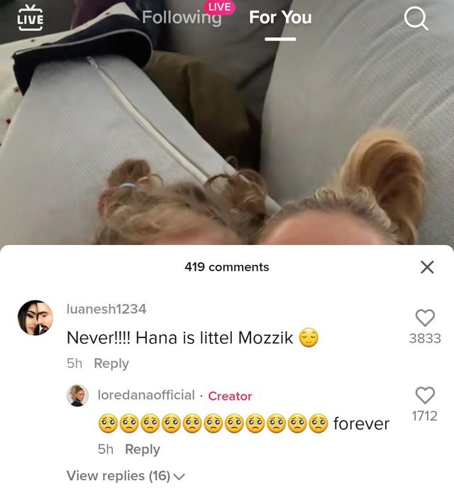 “Kurrë! Hana është një Mozzik i vogël”, i ka shkruar një prej tyre ndërsa Loredana ia ka kthyer: “Përgjithmonë”, duke shprehur dakordësinë me ndjekësin./arbresh.info/