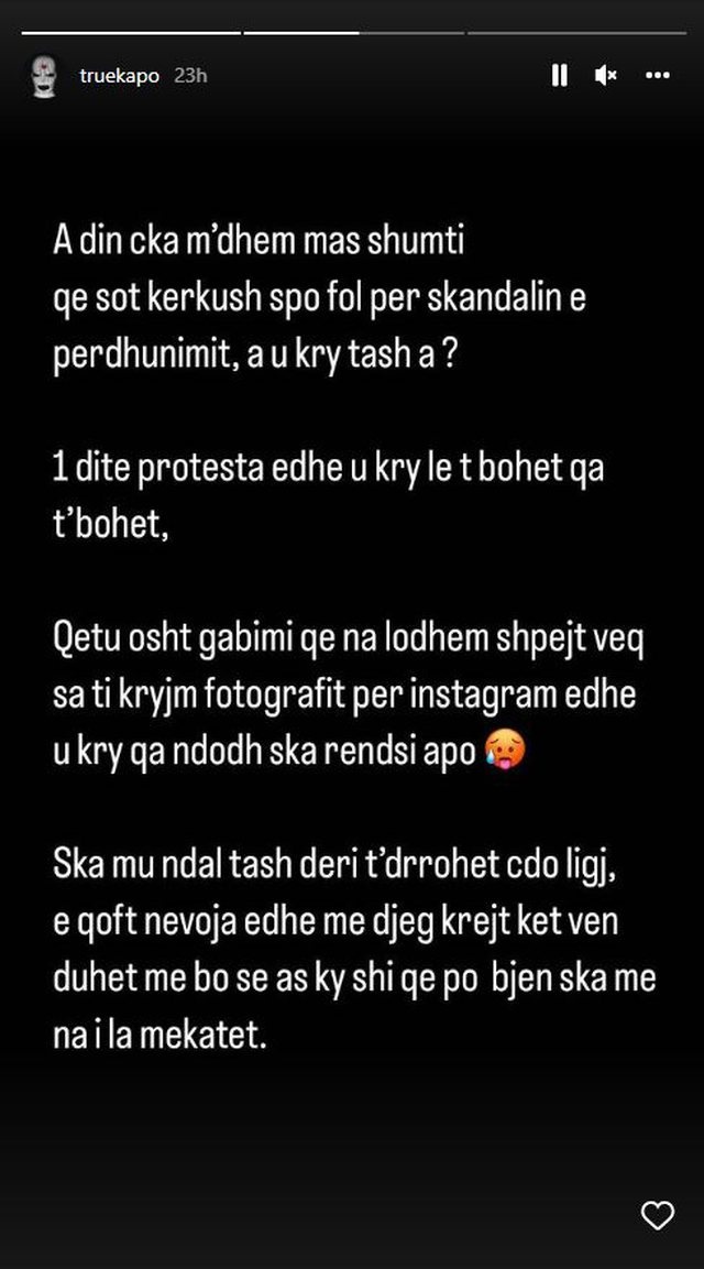 “A e dini çfarë më dhemb më së shumti? Që sot askush nuk po flet për skandalin e përdh*nimit, a mbaroi tani? 1 ditë protesta dhe mbaroi, të bëhet çfarë të bëhet. Këtu është gabimi që ne lodhemi shpejt vetëm sa t’i bëjmë fotot për Instagram dhe mbaroi, çfarë ndodh nuk ka rëndësi. Nuk ka për t’u ndalur tani deri sa të ndryshohet çdo ligj. Edhe qoftë nevoja për ta djegur këtë vend duhet ta bëjmë se as ky shi që po bie s’ka për të na i larë mëkatet”, ka shkruar reperi.