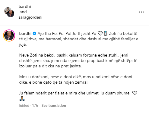 Pas këtij momenti ka ardhur dhe reagimi i parë i çiftit. Në një postim për ndjekësit e tij në Instagram, Bardhi shkroi: