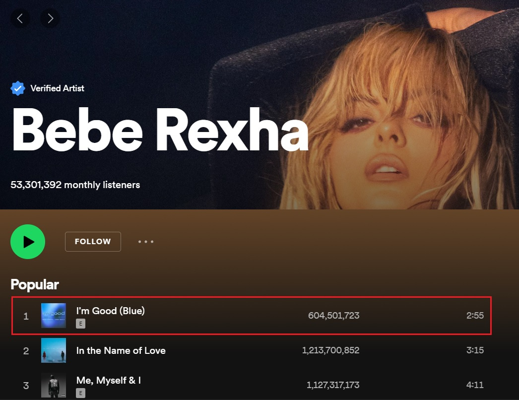 Kënga e saj “I’m Good (Blue)” në bashkëpunim me David Guettan, e cila që nga koha kur u publikua në gushtin e vitit të kaluar, ka pushtuar top-listat britanike dhe amerikane.