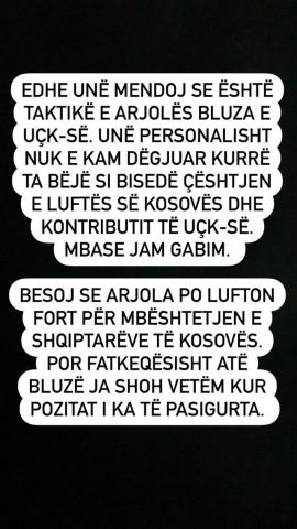 “Edhe unë mendoj se është taktikë e Arjolës bluza e UÇK-së. Unë personalisht nuk e kam dëgjuar kurrë ta bëjë një bisedë për çështjen e luftës së Kosovës dhe kontributit të UÇK-së. Mbase jam gabim. Besoj se Arjola po lufton fort për mbështetjen e shqiptarëve të Kosovës por fatkeqësisht atë bluzë ia shoh vetëm kur pozitat i ka të pasigurta.”, ka shkruar ajo.