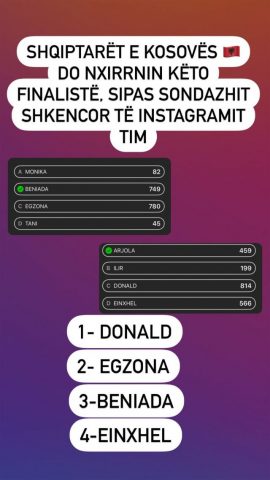 Ish banorja e big Brother, Neda Balluku ka komentuar disa nga banorët VIP brenda shtëpisë së famshme. Ajo ka hapur një votim në profilin e saj në Instagram me pyetjen “Kë mbështesin shqiptarët e Kosovës”? Sipas sondazhit të saj, shqiptarët nga Kosova duan në finale Donaldin, Egzonën, Beniadën dhe Einxhel.