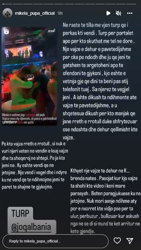 Modelja dhe ish-konkurrentja e Për’puthen, Mikela Pupa, ka rishpërndarë në Instastory videon e xhiruar në një nga klubet e vendit, ku një vajzë thuhet se është droguar dhe shfytëzuar nga dy të rinj.