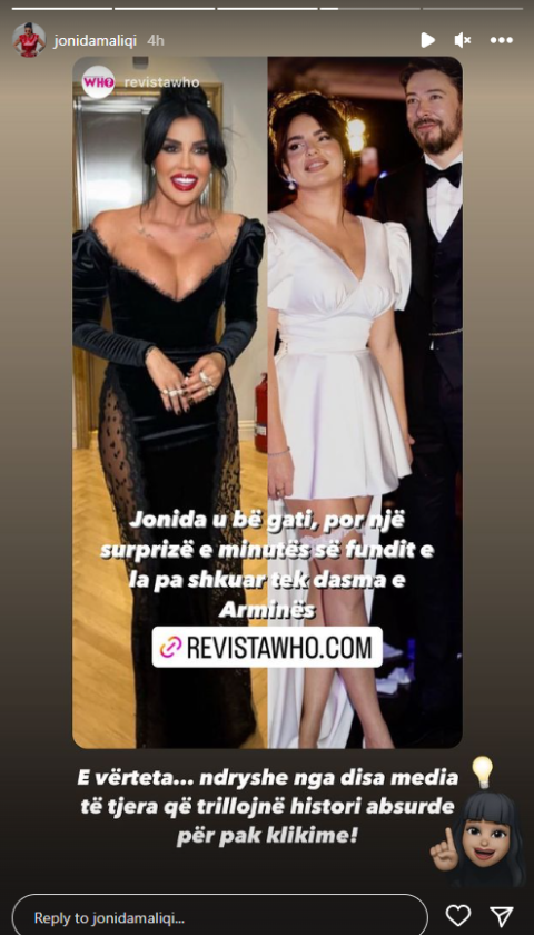 Mirëpo së fundmi Jonida i ka shuar këta zëra me anë të një InstaStory, ku tregoi se për shkak të një arsye personale, të cilën nuk ka dashur ta komentojë, ajo nuk mundi të marrë pjesë në dasmë.