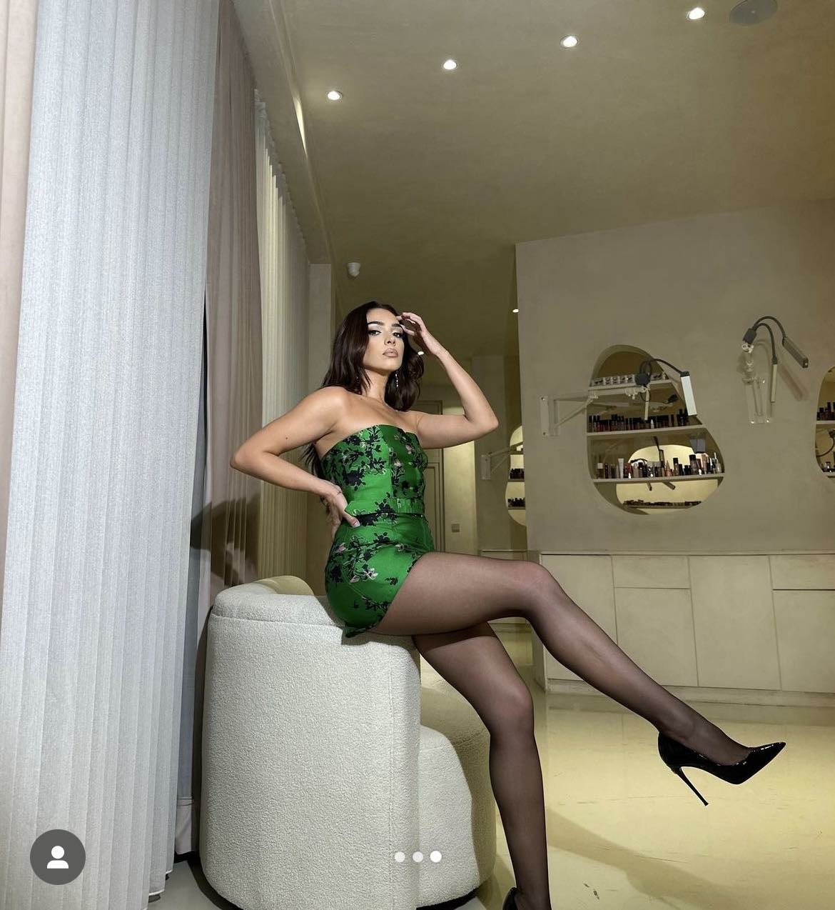 Për sonte ajo ka zgjedhur një fustan të shkurtër jeshil, ku i vë në pah këmbët e saja të gjata.