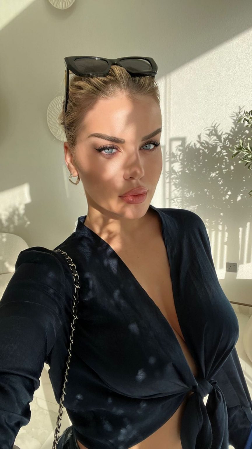 E veshur me një bluzë të shkurtër me ngjyrë të zezë dhe dekoltetë të hapur, Kejvina shihet me grim të lehtë në fytyrë dhe syze dielli po ashtu të zezë që i vendosi mbi kokë.