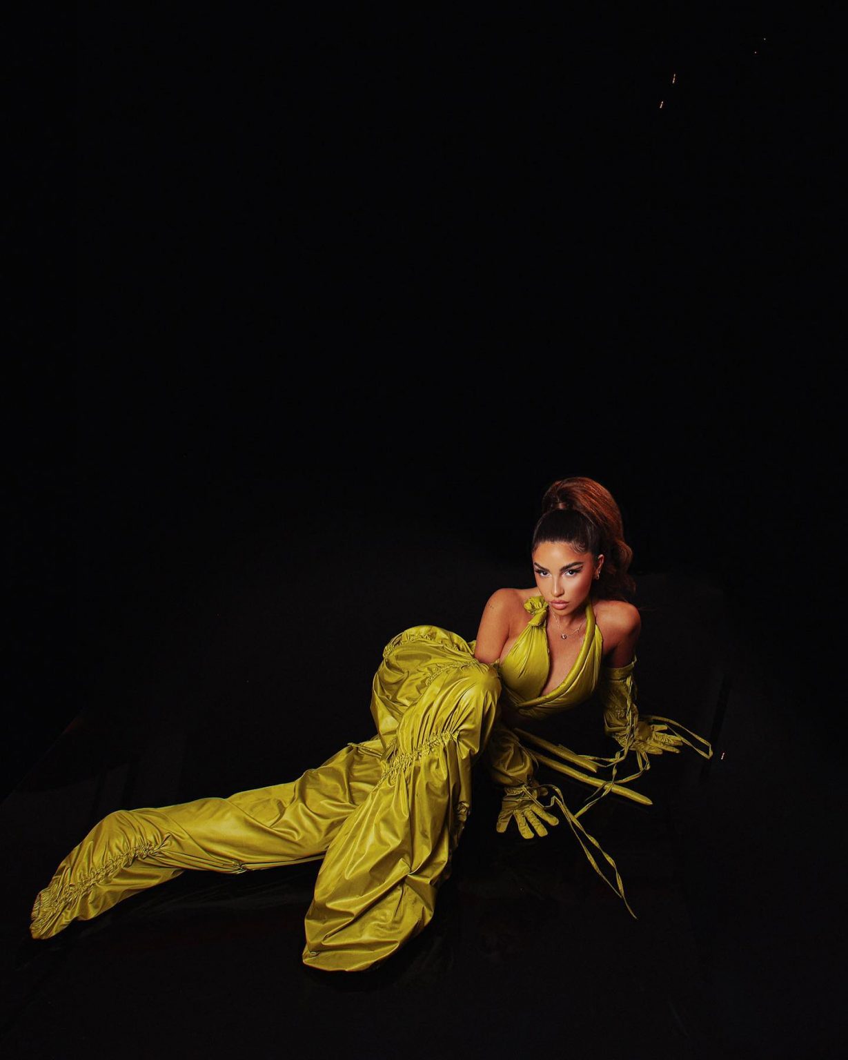 Kësaj radhe, Kida pozoi në një kostum me ngjyrë të gjelbër dhe dekolte të hapur dhe dorëza nga i njëjti model, ku po duket plot shkëlqim teksa shihet me grim të theksuar dhe flokët bisht të vendosura lartë.