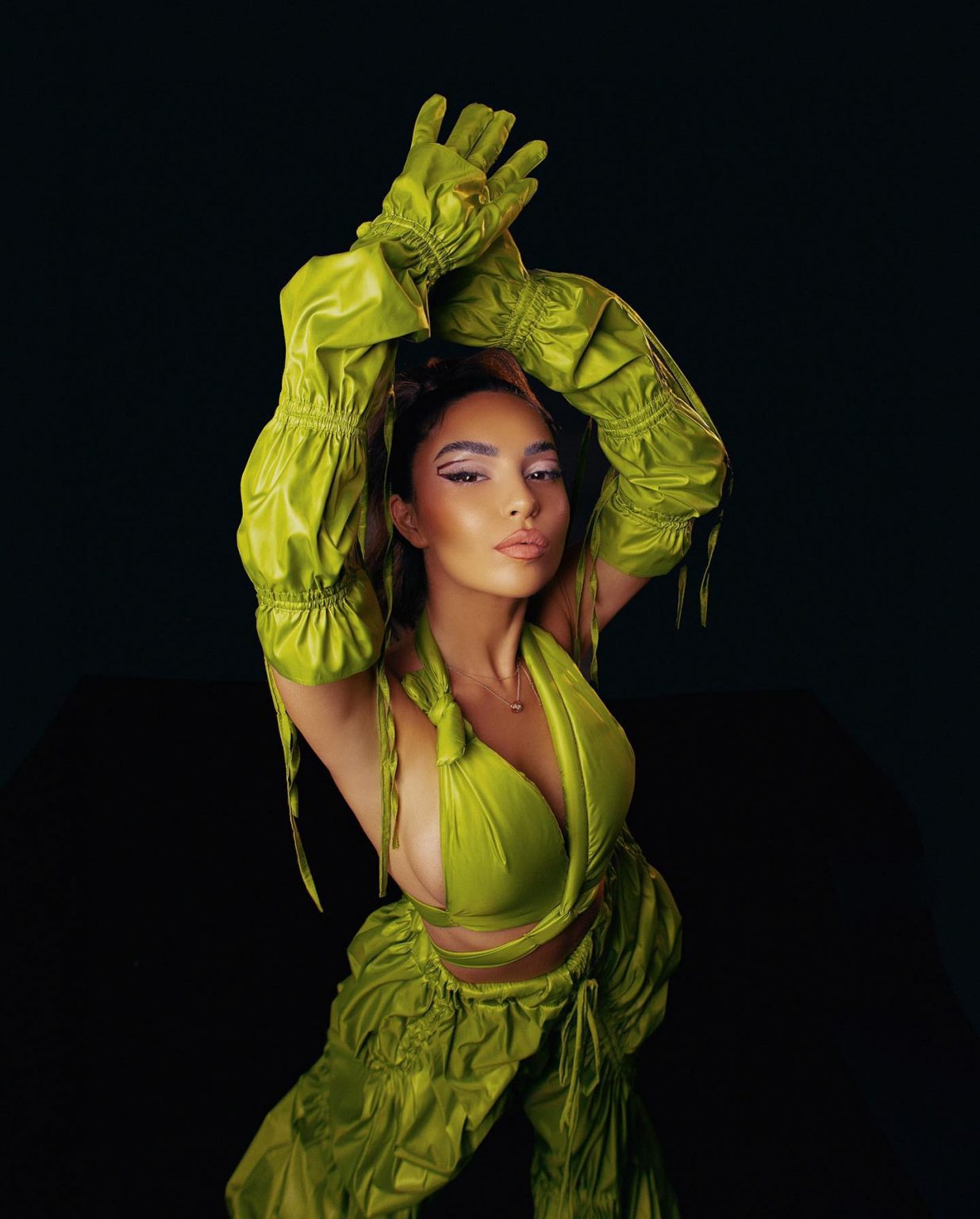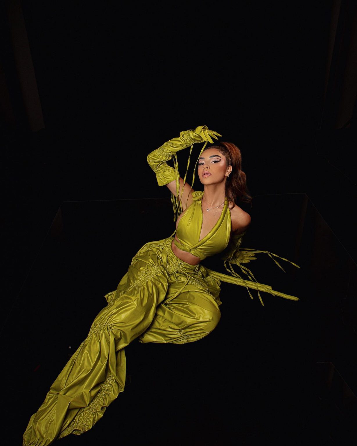 Kësaj radhe, Kida pozoi në një kostum me ngjyrë të gjelbër dhe dekolte të hapur dhe dorëza nga i njëjti model, ku po duket plot shkëlqim teksa shihet me grim të theksuar dhe flokët bisht të vendosura lartë.