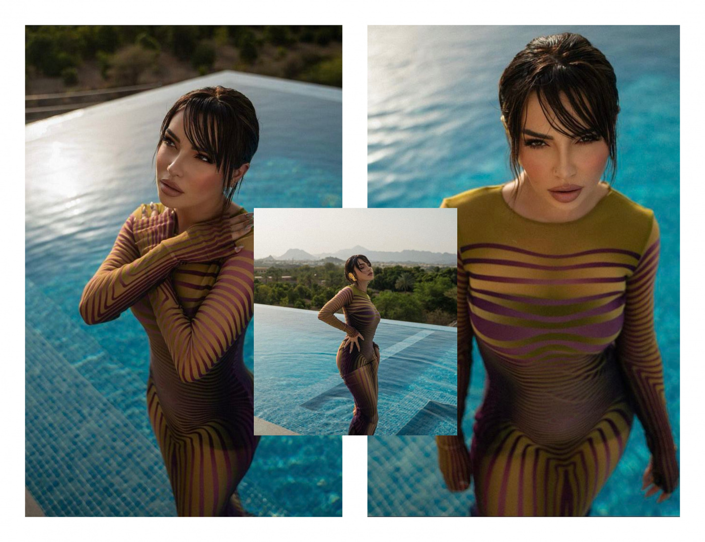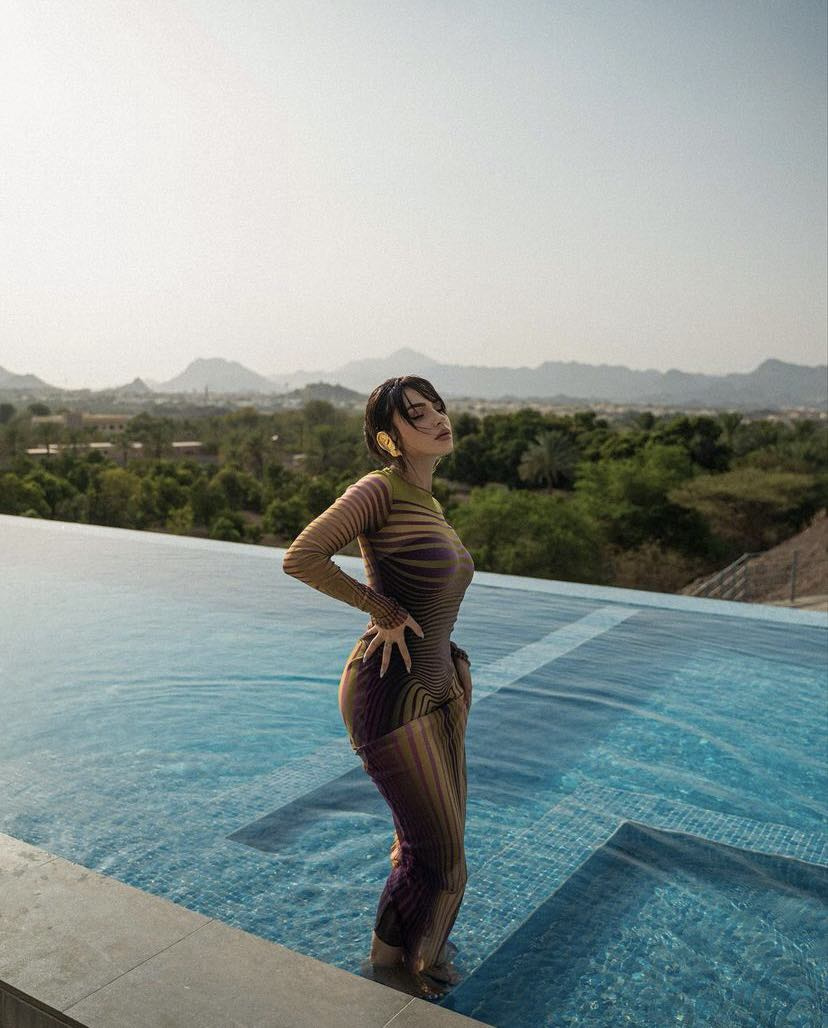 Me poza pranë pishinës, me një fustan të gjatë me ngjyra të ndryshme, Kida duket mahnitëse./Arbresh.info/