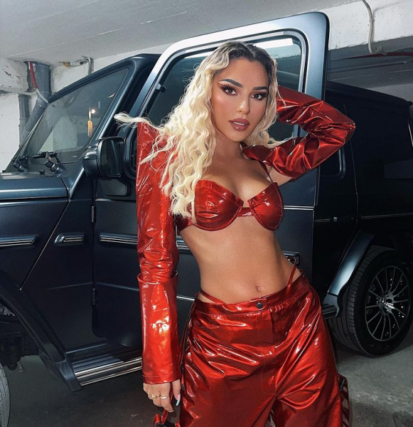 Kida vjen atraktive në veshje lëkure ngjyrë të kuqe, teksa flokët kaçurrele e bën të duket edhe më tërheqëse./arbresh.info/