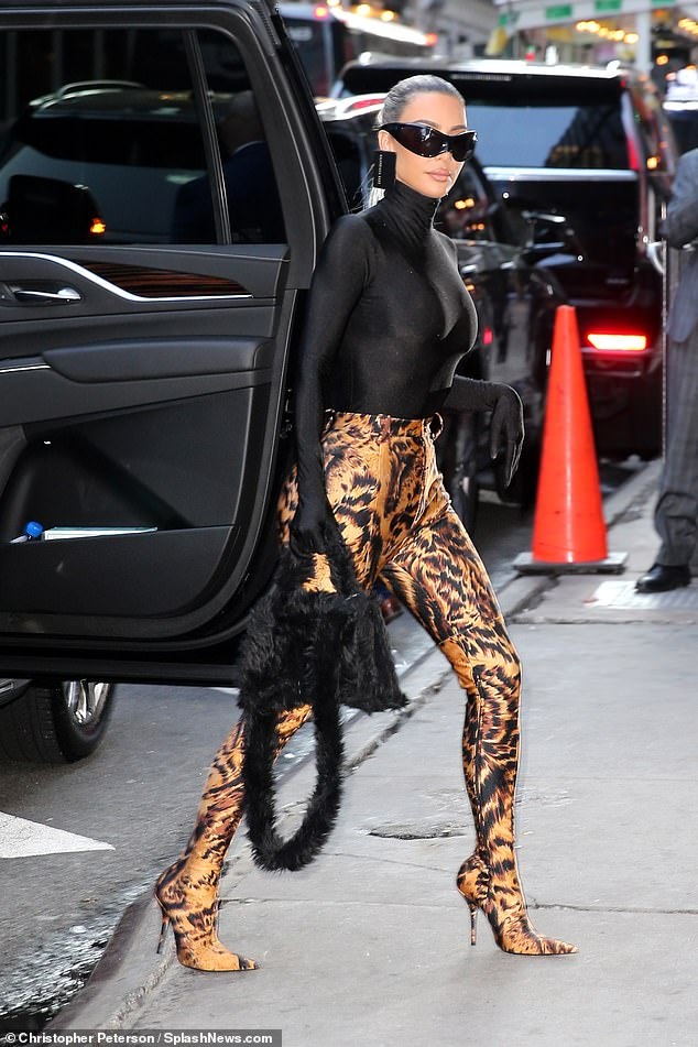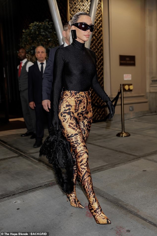 Ylli e kombinoi pjesën e sipërme me në një palë pantallona “Balenciaga” me stampa tigri dhe me çizme, ndërsa mbante në dorë një çantë me pendë të zezë.