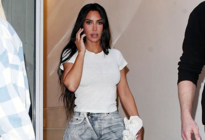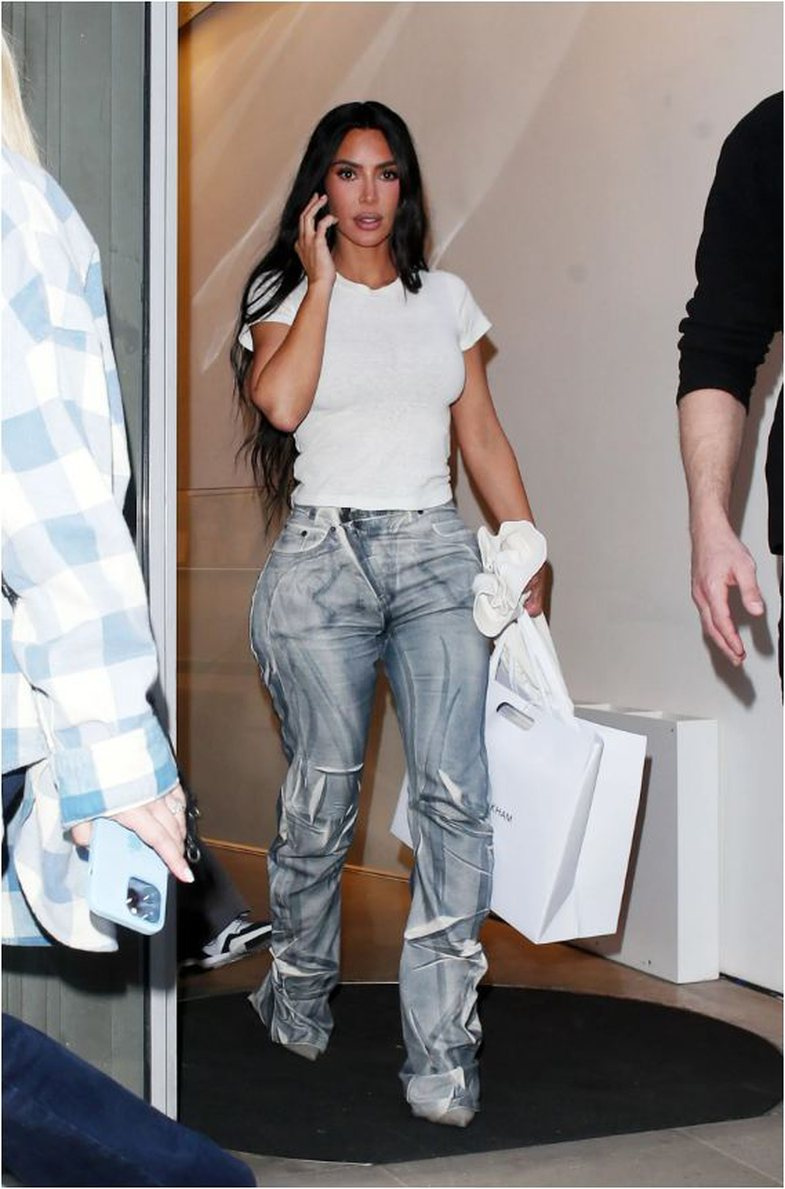 Kim u fotografua me xhinse të rrudhosura, pothuajse. Rrudhat në fakt janë të printuara për t’i dhënë materialit të xhinsit efektin me rrudha.