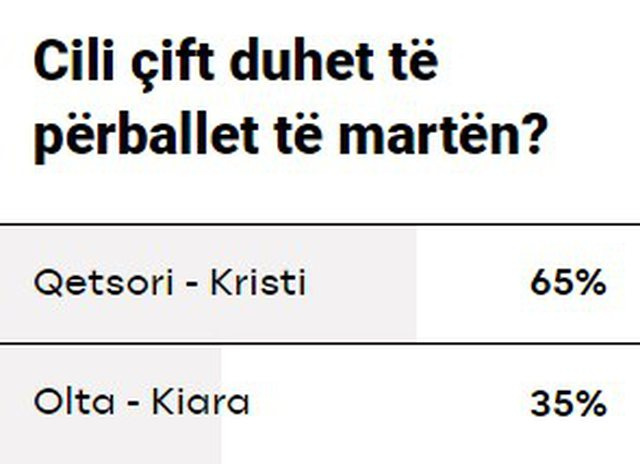 Dy çiftet në televotim këto ditë kanë qenë Qetsor-Kristi dhe Olta-Kiara. Një prej këtyre çifteve do përballet “kokë më kokë” sot dhe të shtunën njëri del.
