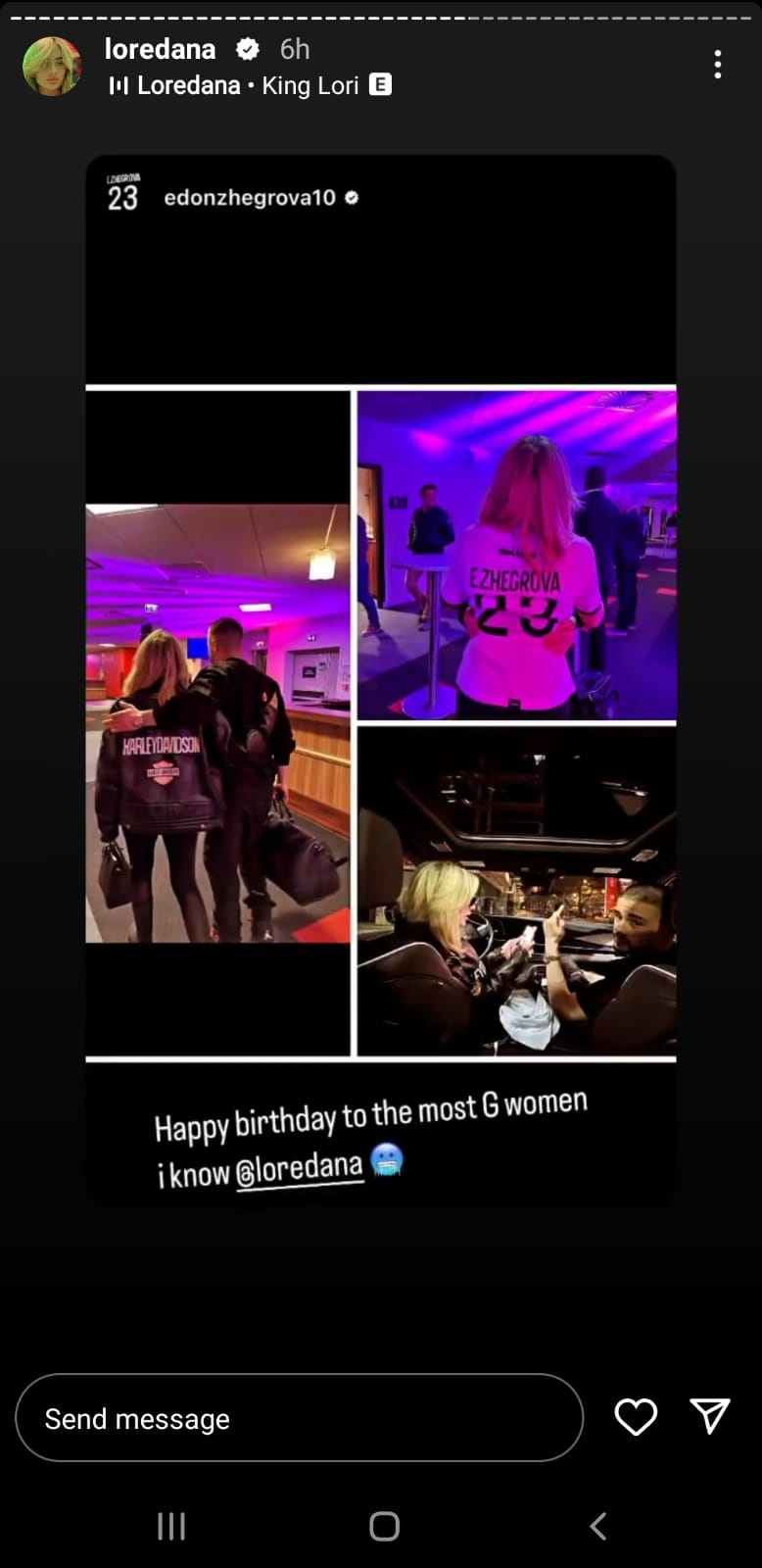 Krah fotove ai shkruan: Gëzuar ditëlindjen gruaja më G(Gangsta) që njoh, duke e shoqëruar me këngën “King Lori”.