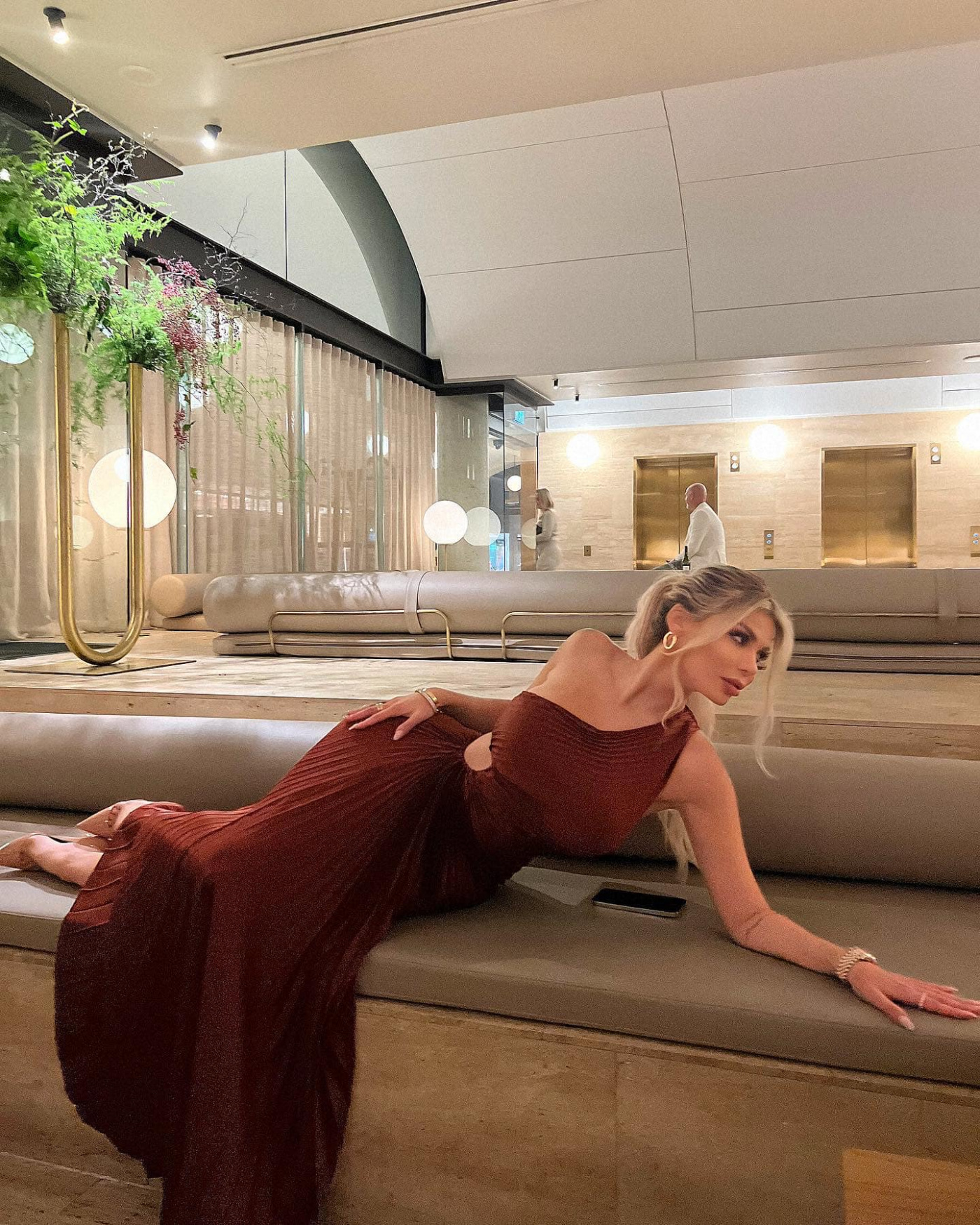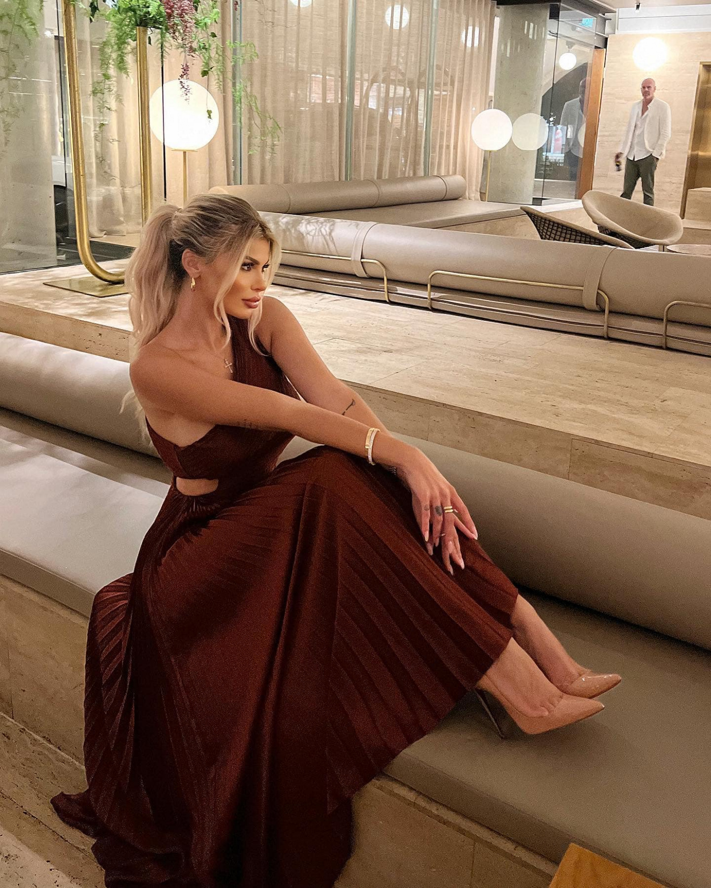 Së fundmi ajo shfaqet me një fustan të gjatë ngjyrë kafe dhe duket mjaftë bukur.