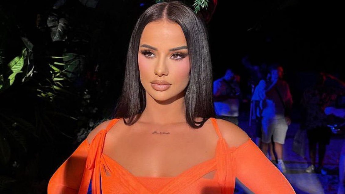 Në foto, autorja e “E kalume”, shihet e veshur me një fustan transparent me ngjyrë të portokalli dhe makijazh të theksuar.