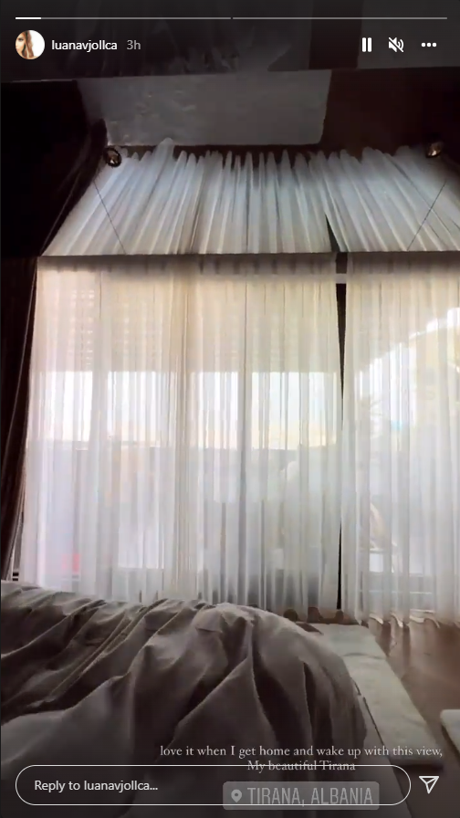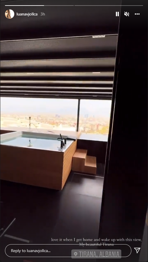 “E dua momentin kur jam në shtëpi dhe zgjohem me këtë pamje. Tirana ime e bukur”, ka shkruar moderatorja krah videos ku duket pamja e plotë e dhomës së gjumit dhe vaska ku relaksohet.