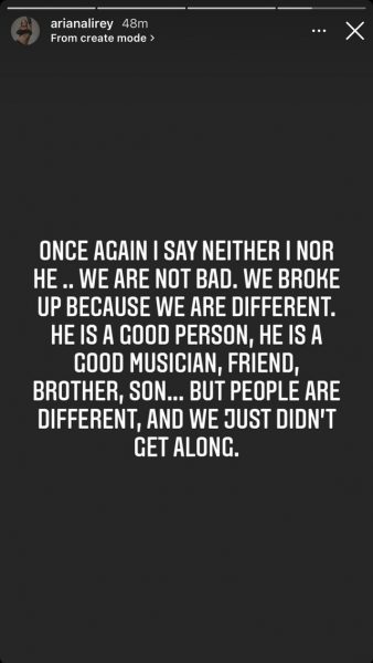 “Edhe një herë them se as unë, as ai… nuk jemi të këqij. U ndamë sepse jemi të ndryshëm. Ai është një njeri i mirë, ai është një muzikant i mirë, shok, vëlla, bir…por njerëzit janë të ndryshëm, dhe ne thjesht nuk u përshtatëm”, ka shkruar modelja.