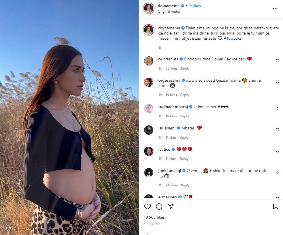Dojna Mema dhe Vlashent Sata do të bëhen së shpejti prindër! Lajmin e konfirmoi vetë moderatorja përmes një postimi në Instagram, ku shfaqej në natyrë me duart mbi barkun e rrumbullakosur.