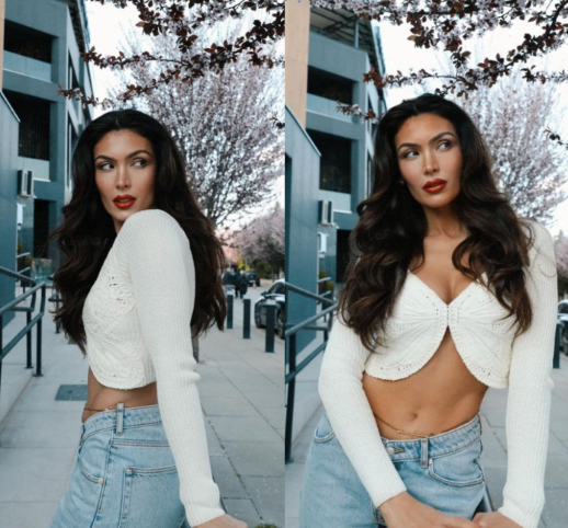 E veshur me një palë xhinse dhe një bluzë të hapur tek beli, Nora ka sjellur ngjyra pranverore.