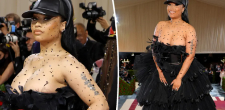 Reperja e “Pink Friday” veshi një fustan të zi me tyl dhe pupla nga “Burberry”, të cilat ajo zbuloi se ishte shumë i vogël dhe e ngushtë për gjoksin e saj.