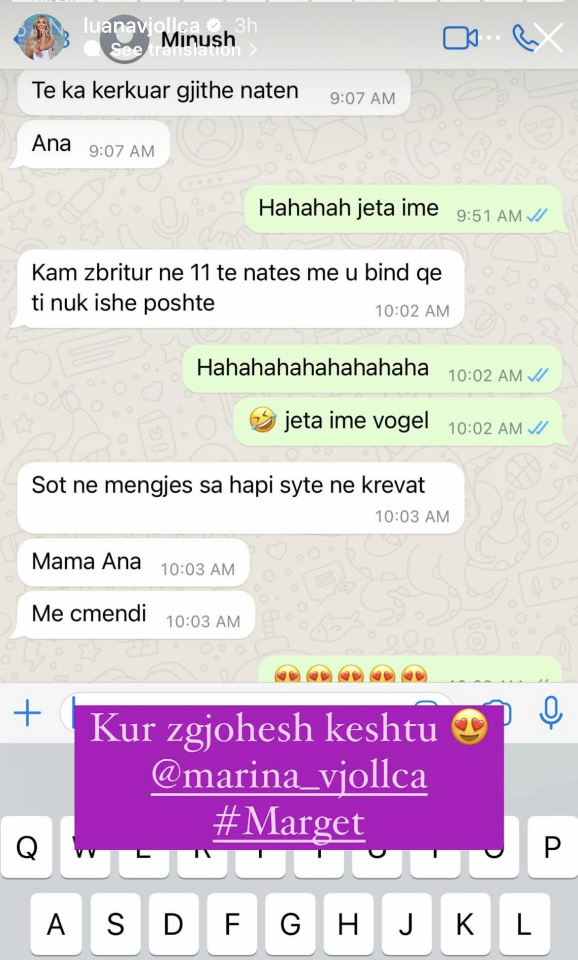 Moderatorja e njohur ka ndarë një pjesë të bisedës në Whatsapp, ku Marina i shkruan se e vogla e saj gjithë natën e ka kërkuar tezen./Arbresh.info/