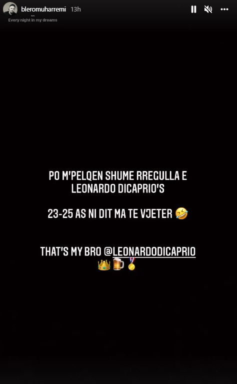 “Po më pëlqen shumë rregulla e Leonardi DiCaprio’s, 23-25 as ni ditë ma të vjetër”, ka shkruar Blero në një fotografi të publikuar në llogarinë e tij në Instagram.