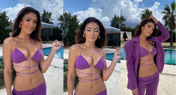 Bukuroshja u shfaq elegante dhe joshëse në një kostum ngjyrë vjollce që ia vinte në pah linjat e formësuara të trupit.