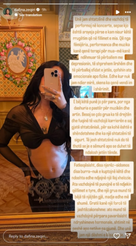 “Unë jam shtatzënë dhe vazhdoj të performoj në koncerte, sepse kjo është arsyeja përse e kam nisur këtë rrugëtim që në fillimet e mia. Që nga fëmijëria, performanca dhe muzika kanë qenë terapi për mua – më kanë ndihmuar të përballem me depresionin, të shprehem lirshëm dhe të përballoj sfidat e jetës, qofshin ato emocionale apo fizike. Edhe kur nuk jam ndier mirë, skena ka qenë vendi im i shërimit”, thuhet në reagimin e Dafinës.