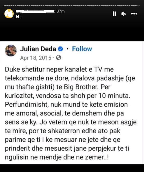 Në rrjet së fundmi është publikuar një shkrim të vitit 2015, ai e kishte quajtur Big Brotherin një emision të dëmshëm dhe pa sens.