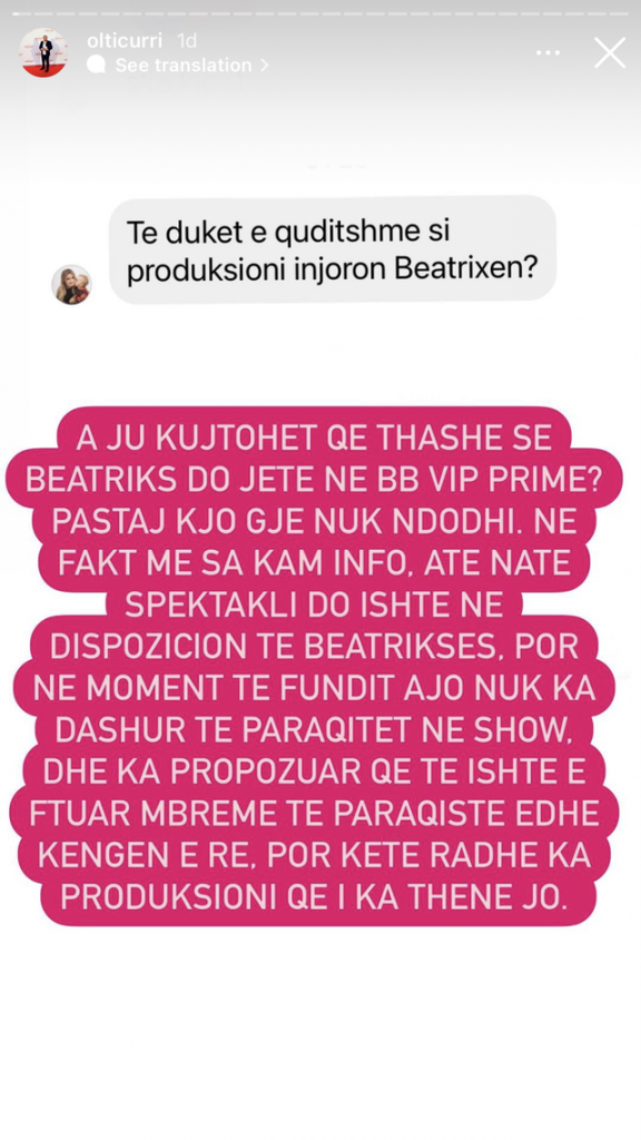 “Atë natë, spektakli do të ishte në dispozicion të Beatrixës, por në moment të fundit ajo nuk ka dashur të paraqitet në show dhe ka propozuar që të ishte e ftuar mbrëmë të paraqiste këngën e re, por këtë radhë, produksioni i ka thënë jo”, ka shkruar Olti Curri në një Instastory.