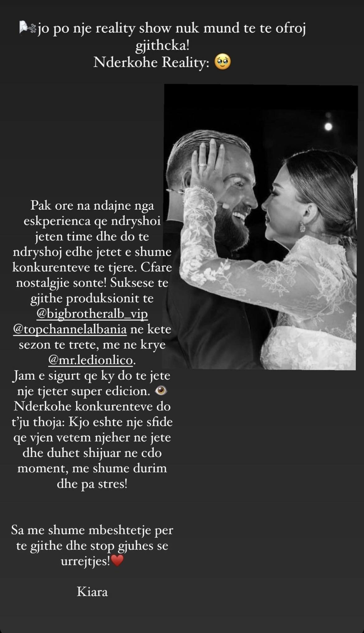 “Kjo është një sfidë që jen vetëm njëherë në jetë dhe duhet shijuar në çdo moment, me shumë durim she pa stres. Sa më shumë mbështetje për të gjithë ju dhe stop gjuhës së urrejtjes”, shkruan Kiara, përcjell Arbresh.info