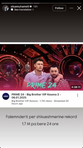 Olsa Muhameti, autore e Big Brother VIP Kosova ka ndarë një foto në “Instagram” që tregon se prime i kaluar ka thyer rekord shikushmërie, për 24 orë ka arritur 1.7M klikime.