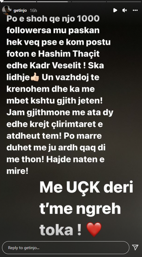 Pas këtij postimi, Getinjo thotë se ka një mijë ndjekës më pak por që do të vazhdojë të krenohet me ta.