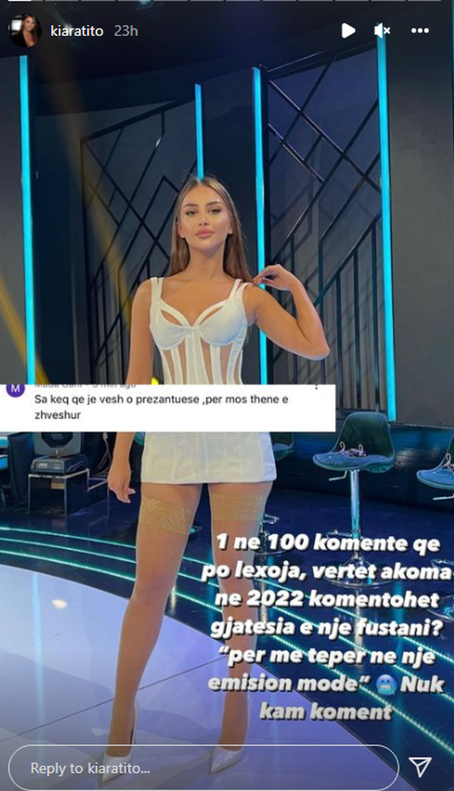 Kiara përgjigjet: “1 në 100 komente që po lexoja. Vërtet akoma në 2022 komentohet gjatësia e një fustani? Për më tepër në një emision mode. Nuk kam koment.”