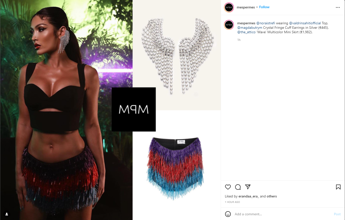 Vetëm për mini-fundin që ajo kishte zgjedhur ta vishte, Nora Istrefi shpenzoi plot 1.982 euro, veshje kjo nga marka “The attico”, derisa e kishte kombinuar me një palë vathë kristale me çmim 445 euro.