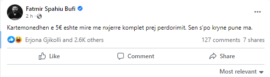 “Kartemonedhen e 5€ eshte mire me nxjerre komplet prej perdorimit. Sen s’po kryne pune ma”, ka shkruar “Bufi”