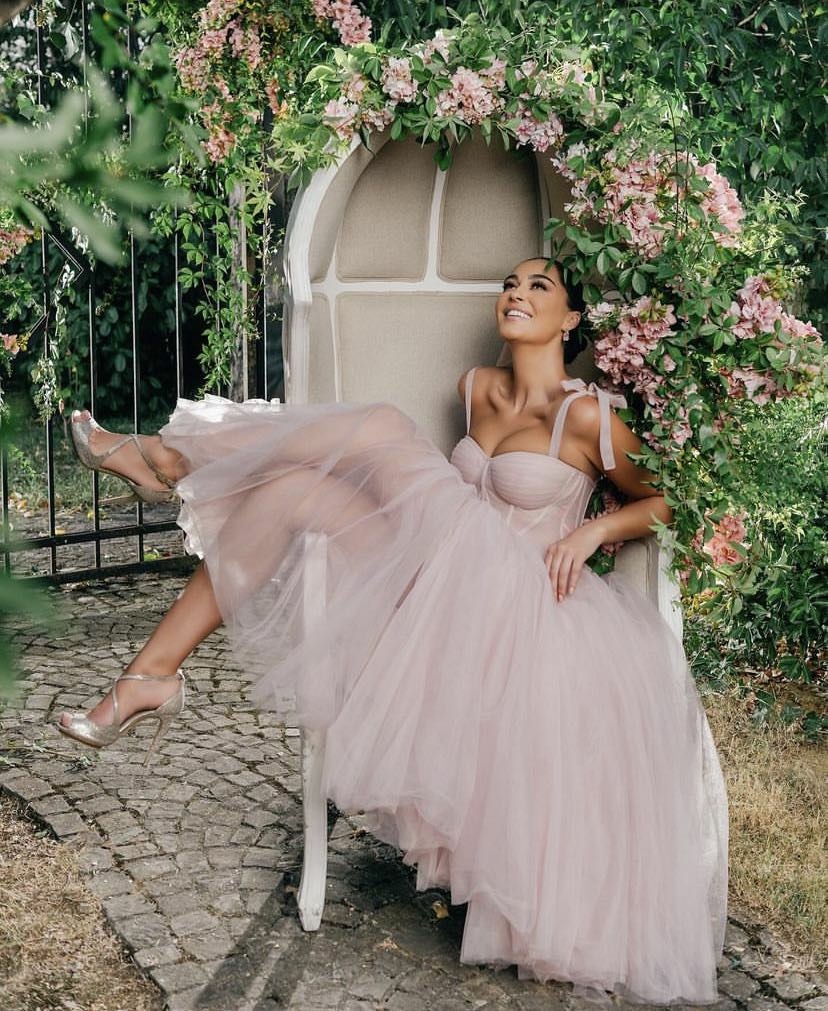 Së fundmi, Adrola ka publikuar një fotografi ku shfaqet tejet simpatike me një fustan pink e ulur në një stol të mbushur me lule.