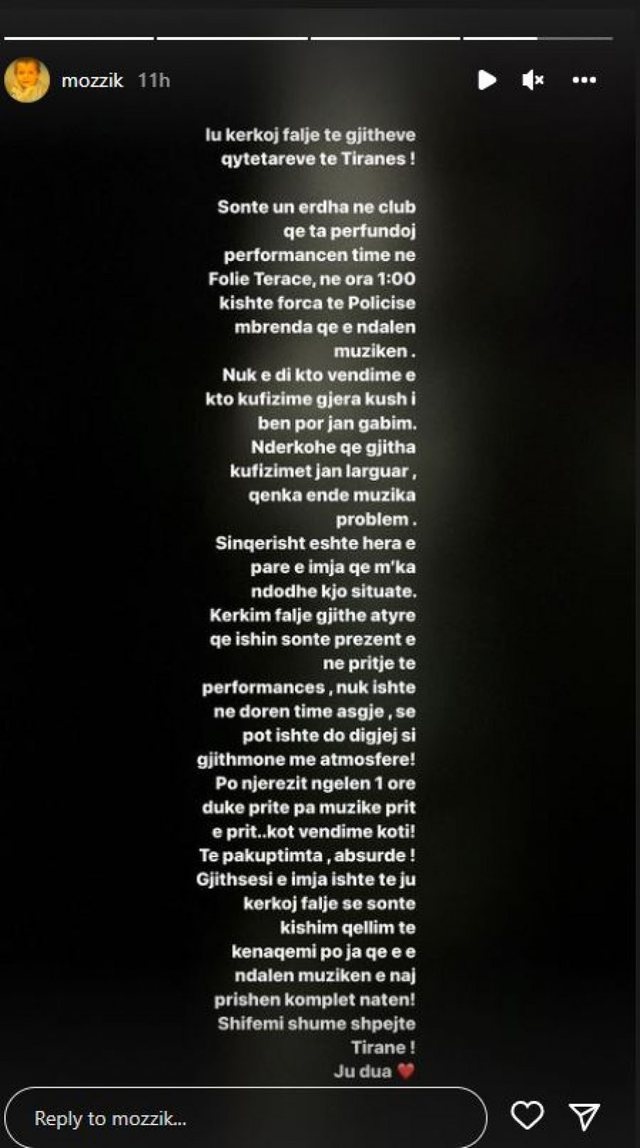 Sonte unë erdha në klub që të përfundoj performancën time në Folie Terace, në ora 1:00 kishte forca të Policisë brenda që e ndalen muzikën.